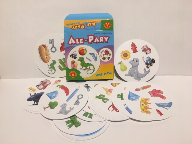 Ale Pary MISZ-MASZ to szybka, prosta gra karciana, w której wygrywa ten kto wykaże się największą spostrzegawczością. W opakowaniu znajdziemy zestaw 31 kart z 6 obrazkami na każdej z nich. Dwie dowolne karty zawsze mają po jednym wspólnym obrazku, ale żeby nie było zbyt łatwo, obrazki te często mają różną wielkość. Gra polega na jak najszybszym znalezieniu wspólnego obrazka. W zależności od wariantu wygrywa ten, kto zdobędzie najwięcej kart, bądź jak najszybciej pozbędzie się wszystkich.