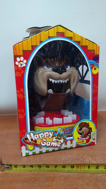 Naciskaj delikatnie kości w misce. Gdy naciśniesz niewłaściwą kość, pies będzie chciał obronić swoje jedzenie i ugryźć cię w palec. Gdy pies schwyta Twój palec, odpadasz z gry. Wesoła gra przeznaczona dla małych i dużych, ale można także pojedynczo trenować swój refleks. Po każdym zamknięciu paszczy, resetuje się ją poprzez ponowne odciągnięcie psa do tyłu. Leżąc przy swojej misce nadal będzie czujny, więc UWAŻAJ!!! Zabawka bardzo ładnie i estetycznie wykonana. Zwierzątko w kolorze brązowym z beżowym pyszczkiem, czerwoną obrożą i miską pełną kości.