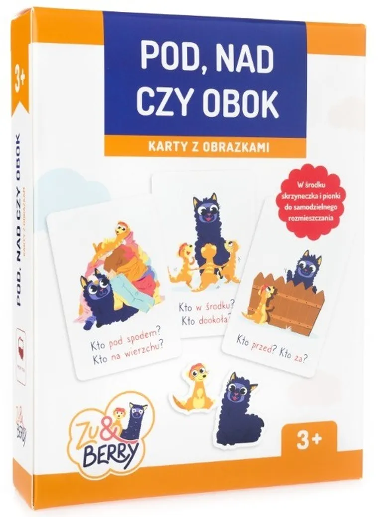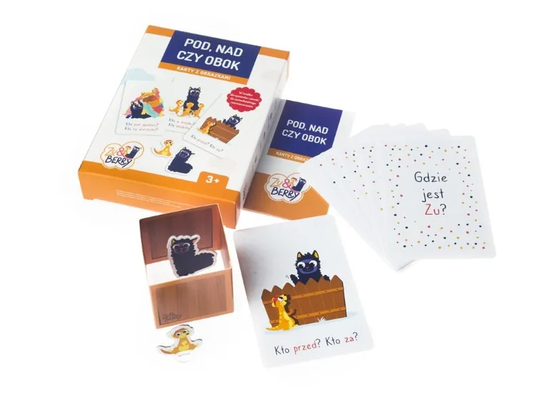 Bohaterami kart są sympatyczne postacie – surykatka Zu i alpaka Berry – które pojawiają się w różnych konfiguracjach przestrzennych. Dodatkową atrakcją jest możliwość samodzielnego rozmieszczania pionków Zu i Berry na kartonowej skrzyneczce, co zwiększa zaangażowanie dziecka i wspiera naukę poprzez działanie.