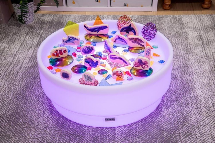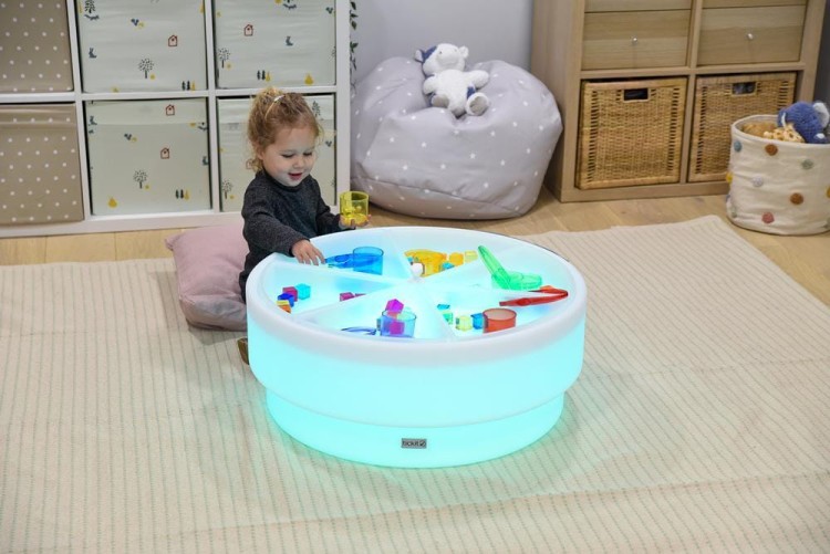 Podświetlany niski stolik z zagłębieniem – stolik sensoryczny to wszechstronne narzędzie edukacyjne stworzone z myślą o niemowlętach i małych dzieciach, które dopiero odkrywają świat zmysłów, kolorów i tekstur. Stolik umożliwia dzieciom angażującą zabawę, rozwijając percepcję wzrokową, motorykę małą oraz umiejętności społeczne, takie jak współpraca i dzielenie się w grupie.