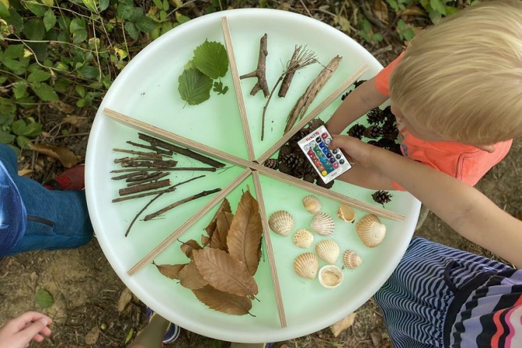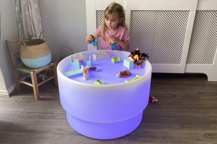 Stolik emituje miękkie kolorowe lub białe światło, które można regulować za pomocą pilota, pozwalając na dostosowanie atmosfery do aktywności. Podniesiona zewnętrzna krawędź tworzy bezpieczny obszar do sortowania, układania przedmiotów oraz eksploracji różnych materiałów, takich jak woda, piasek, galaretka czy pianka.