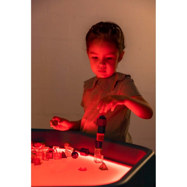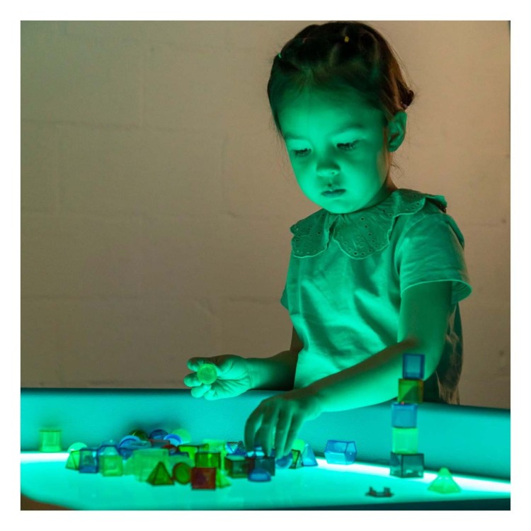 Materiał został specjalnie zaprojektowany do pracy na podświetlanych stolikach sensorycznych, gdzie kolory i kształty stają się jeszcze bardziej wyraziste. Zabawa światłem pobudza ciekawość dziecka, zachęca do eksperymentowania i wzmacnia percepcję wzrokową, czyniąc naukę geometrii naturalną i angażującą.